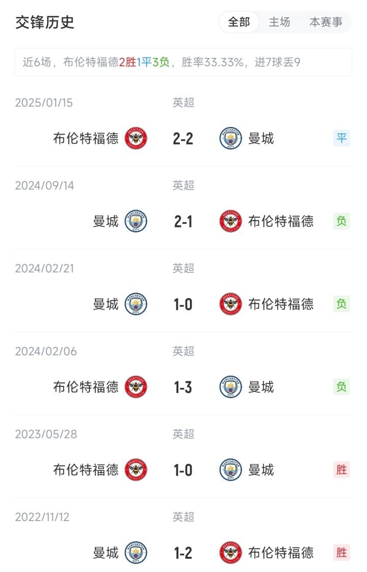 截至赛前,曼城3胜1平2负积10分,排名英超积分榜第8;布伦特福德2胜1平3负积7分,排名英超积分榜第14。
