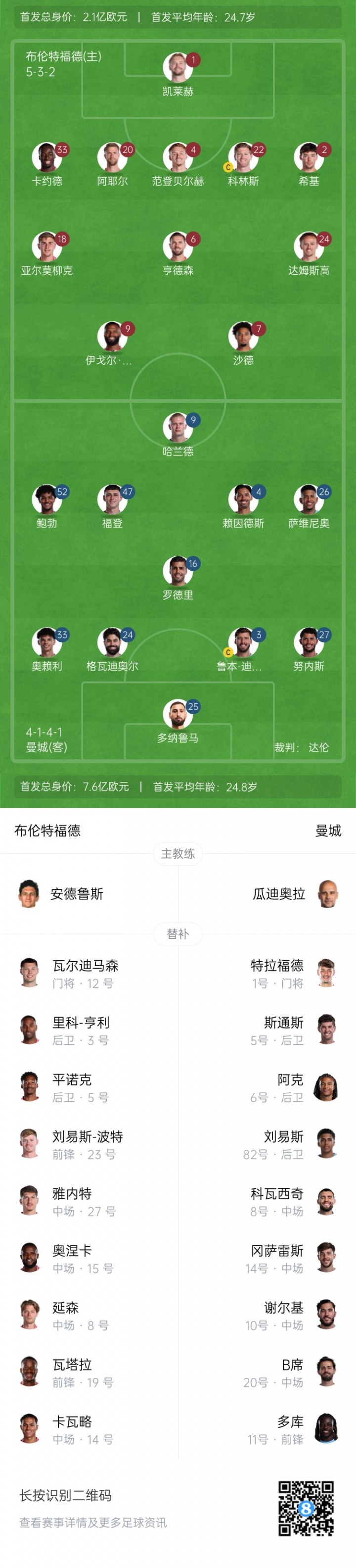 2025-10-06 10:50:02曼城客战布伦特福德首发:哈兰德、罗德里先发,鲍勃、努内斯出战